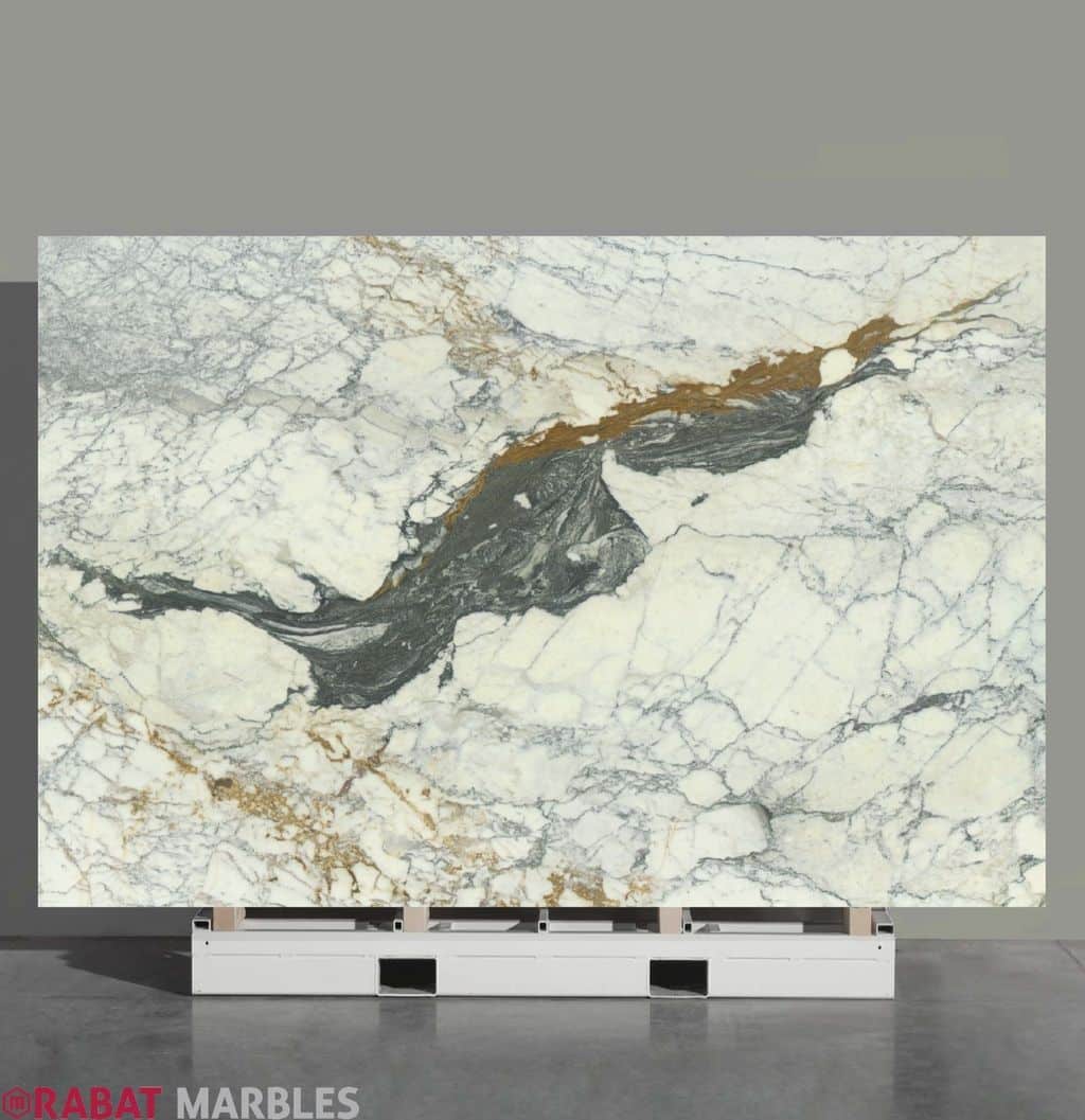 Calacatta Picasso marble is a bold and artistic natural stone, featuring a creamy white background with dramatic veins in shades of gold and gray. Its striking, painterly patterns give it a unique character, making it perfect for statement pieces like feature walls, and luxurious flooring. Calacatta Picasso brings a refined yet expressive touch to high-end interiors.
