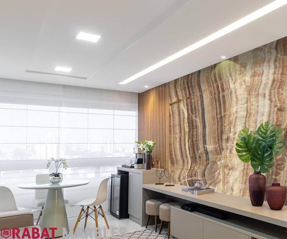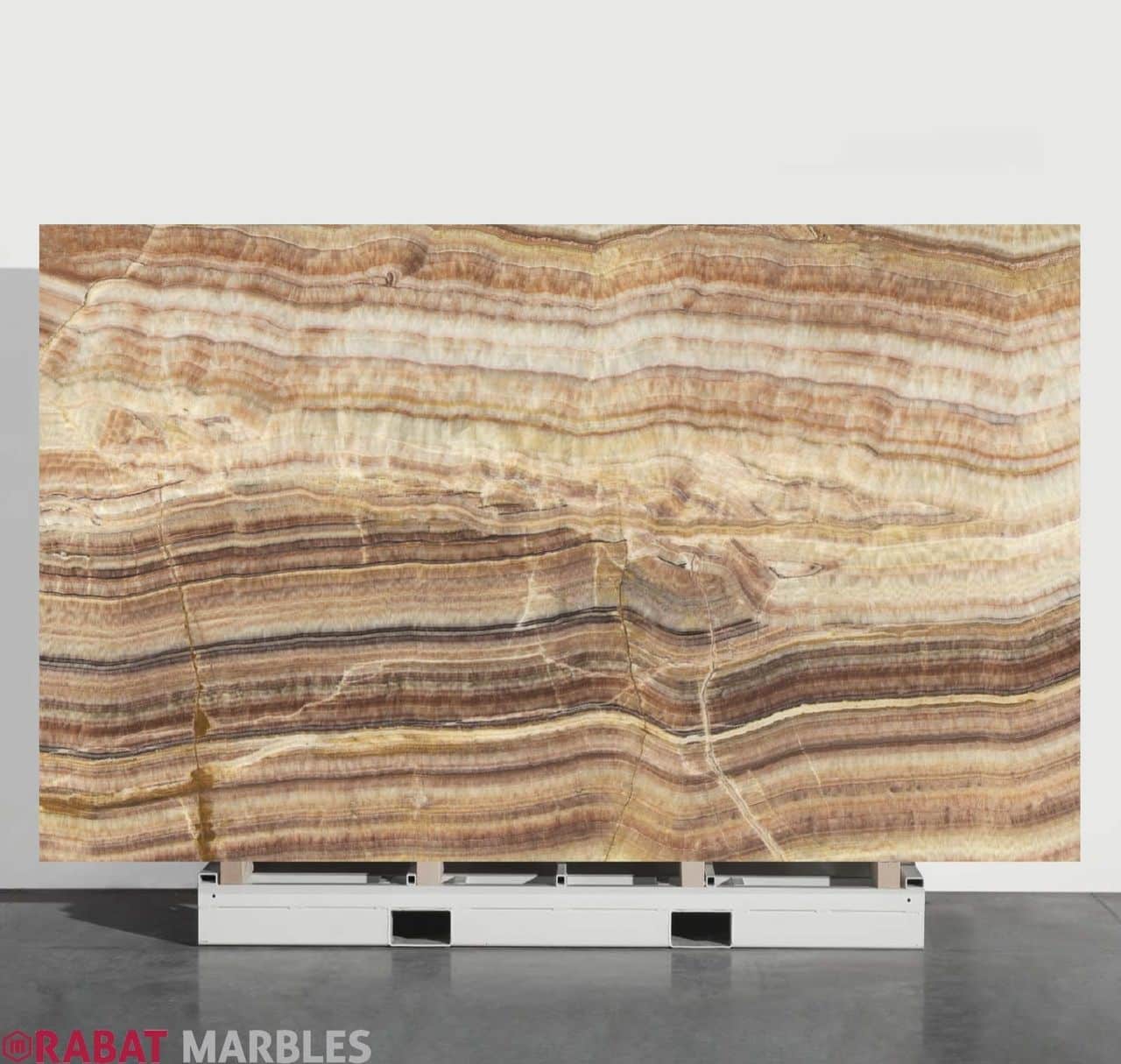Fantastico Onyx, quarried in Eskisehir, Turkey, is a visually stunning natural stone renowned for its vibrant color palette of reds, browns, and golds. This onyx is notable for its translucency, which allows light to pass through and enhance its intricate veining, creating a captivating glow. The stone features meandering veins in white, cream, and yellow that contrast with its rich background, adding depth and uniqueness. Ideal for backlit wall panels, and decorative elements, Fantastico Onyx is prized for its luxurious appearance and dramatic visual impact.